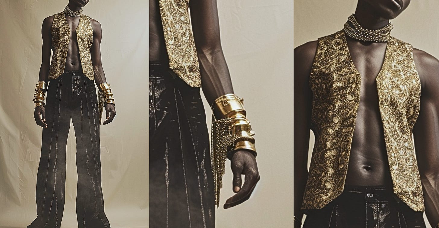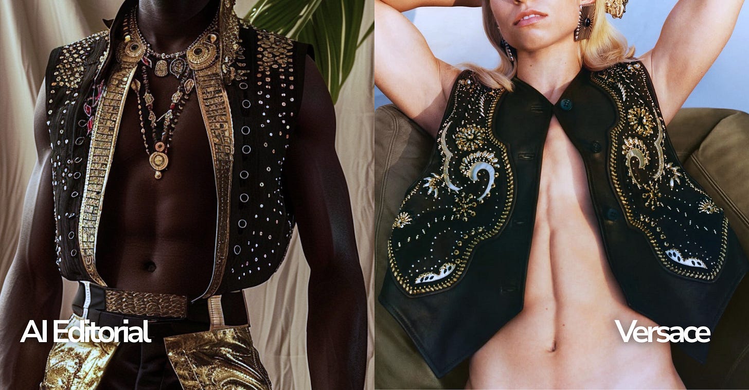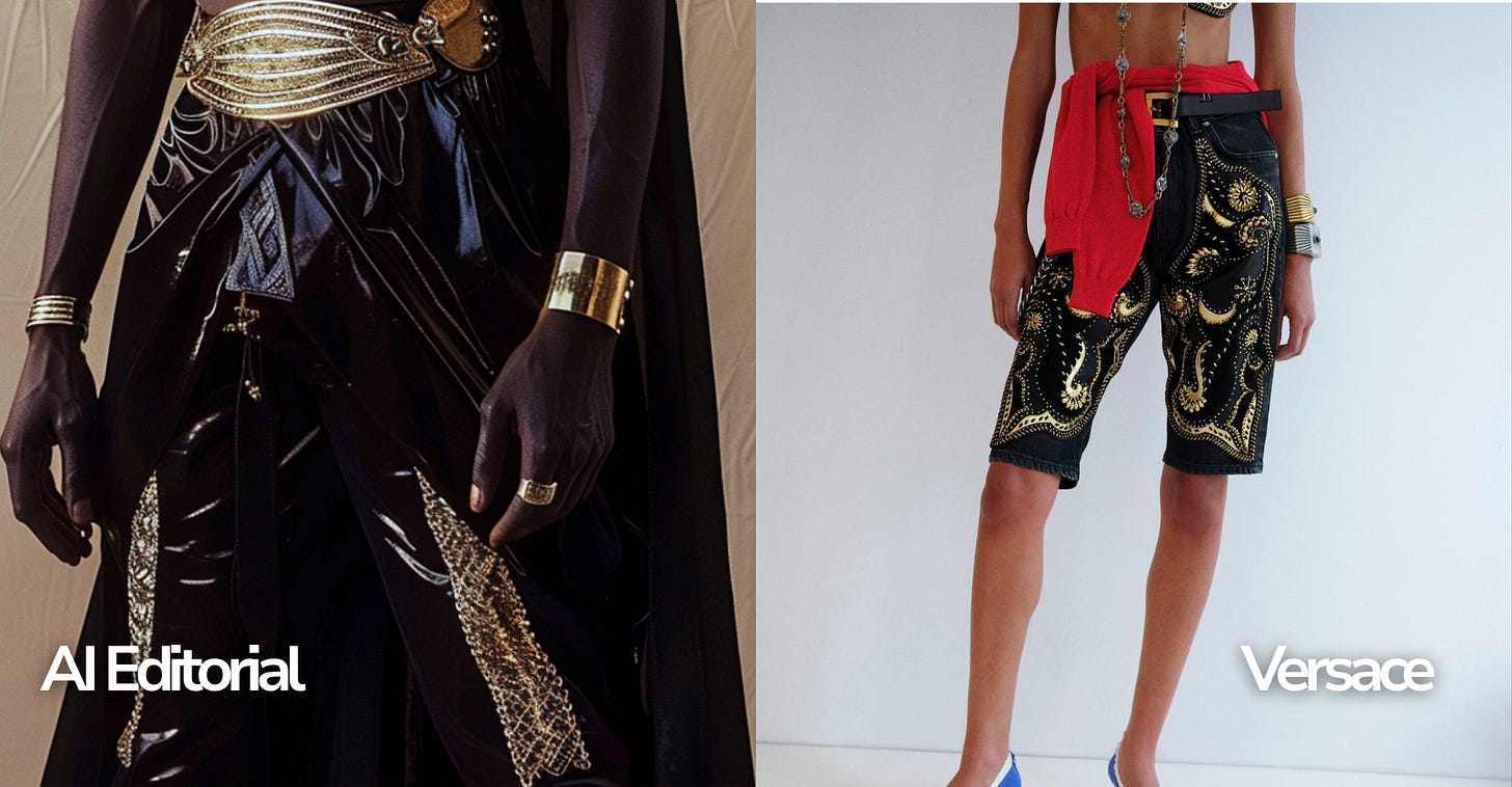 Then, earlier last week, I saw Dario Vitale’s debut collection for Versace. What caught me off guard was the similarity in certain details to my own AI concepts from two months prior. Not because I believed anyone had copied my work, but because it showed how two creators, working from entirely different inspirations, could arrive at surprisingly aligned visions.